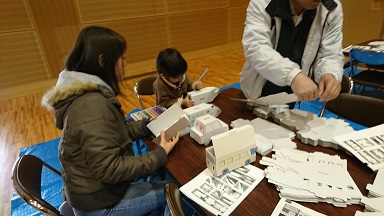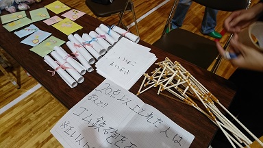 里山総領体育館に行ってみると、総領中学校の生徒たちの手作りの遊びが楽しそうです。賞品も工夫して作っていました!